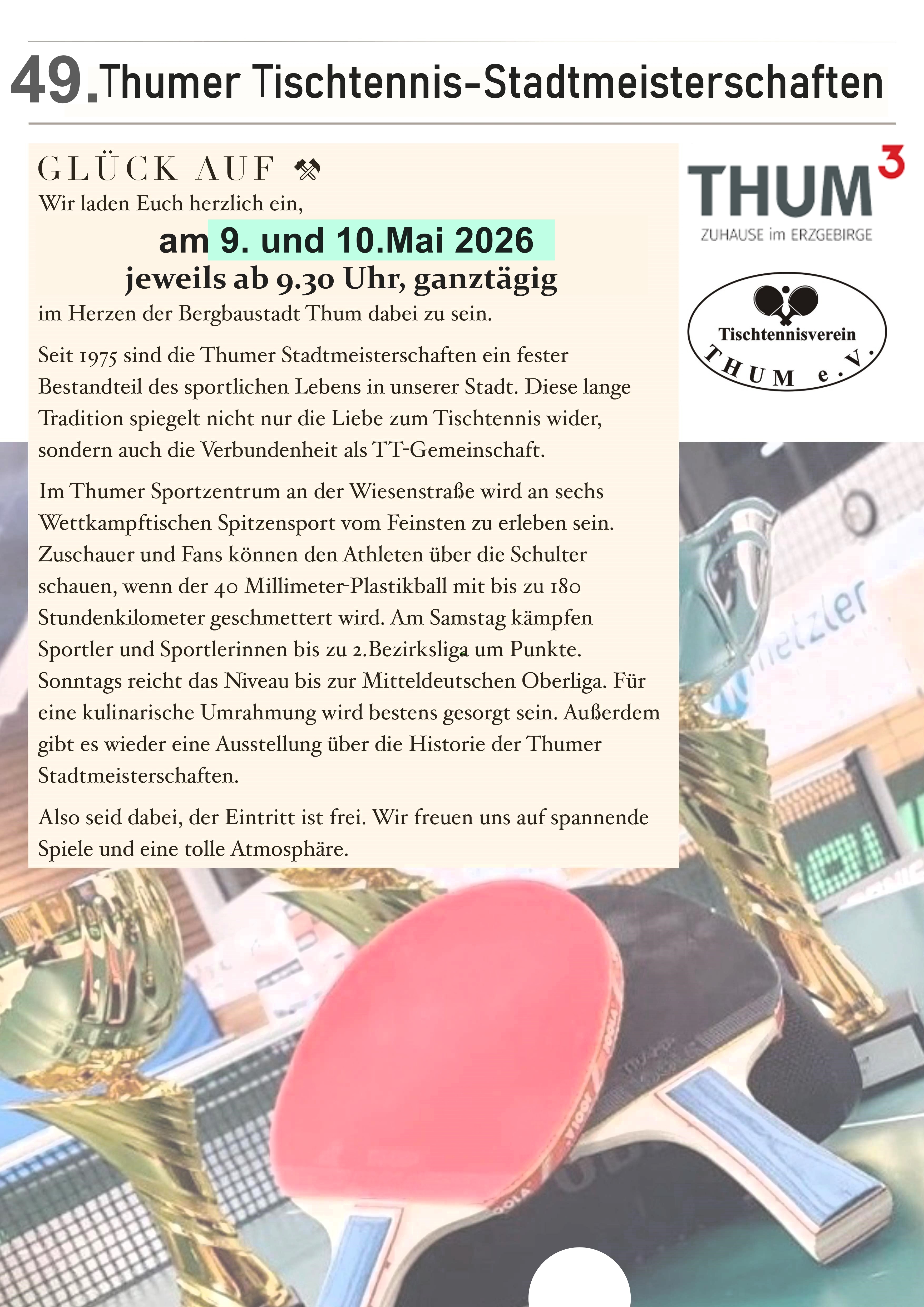 Wenn im Mai die Schläger schwingen, wird die Bergstadt Thum einmal mehr zum pulsierenden Zentrum des Tischtennissports: Die 49. offenen Thumer Stadtmeisterschaften stehen vor der Tür – ein Event, das Leidenschaft, Spannung und viele tolle Sportmomente verspricht!